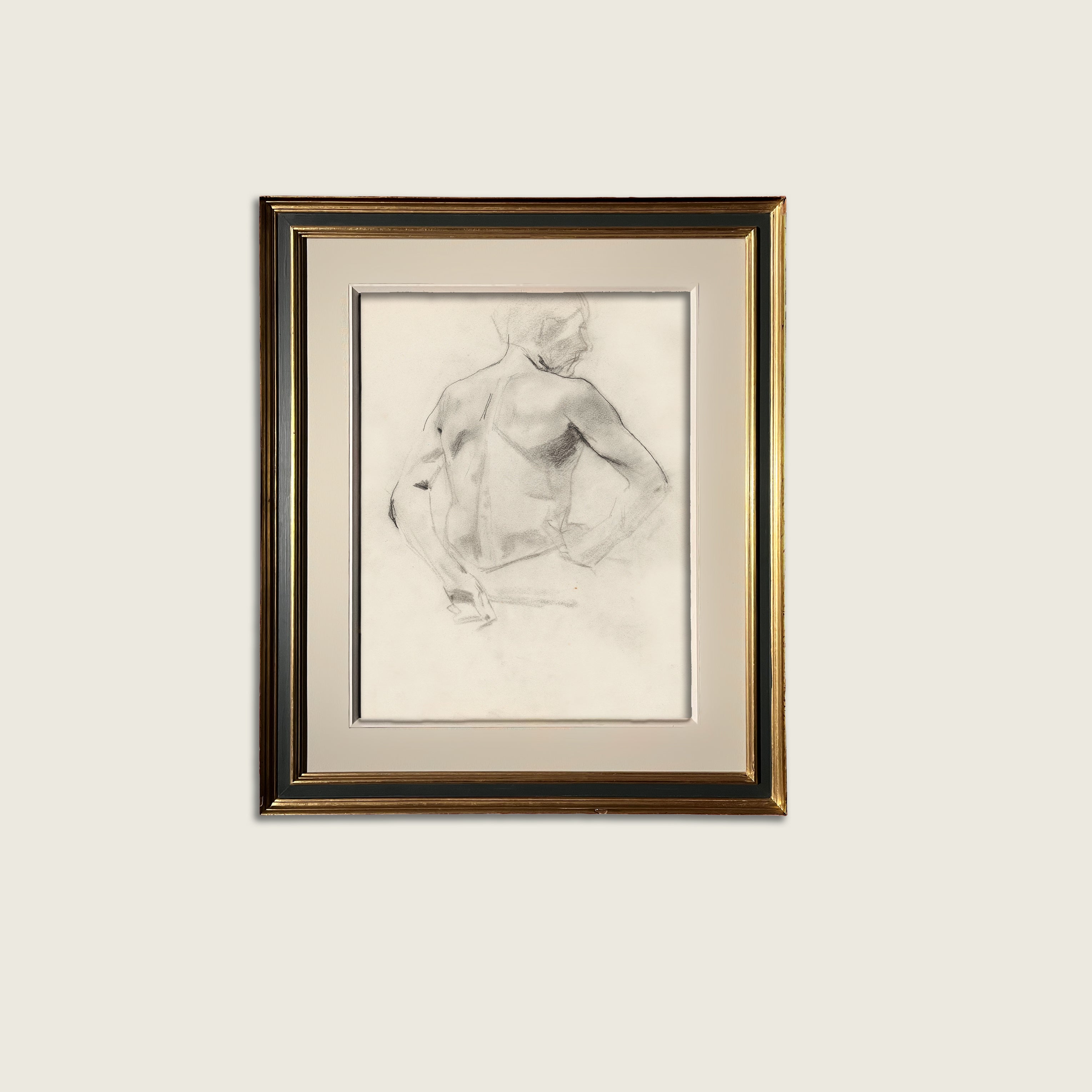 A delicate charcoal sketch capturing the quiet strength of the human form. Minimal and timeless, this piece brings a subtle sophistication that complements living rooms, studies, or serene reading nooks.