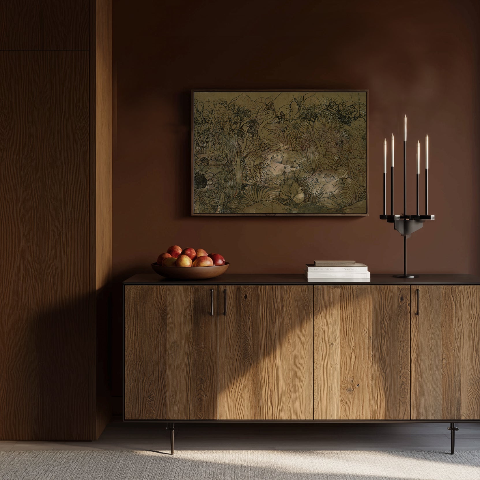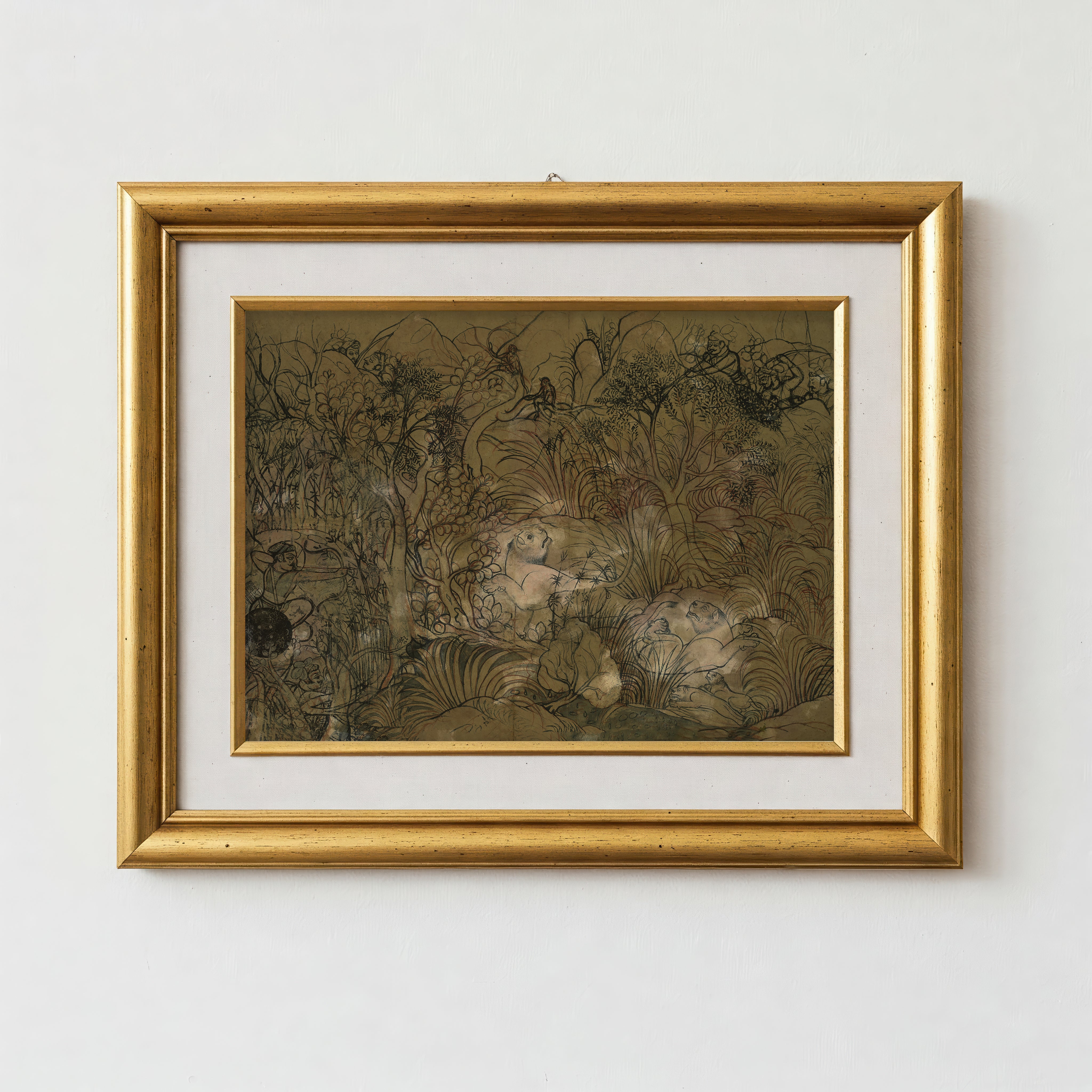 A striking historical figurative artwork depicting a regal hunting scene with rich jewel tones, intricate detailing, and dynamic movement. Bold color, rhythmic pattern, and narrative composition create a collected, worldly feel with timeless appeal. Ideal for eclectic, global, and curated interiors, this piece adds depth, drama, and cultural sophistication to gallery walls and statement spaces.