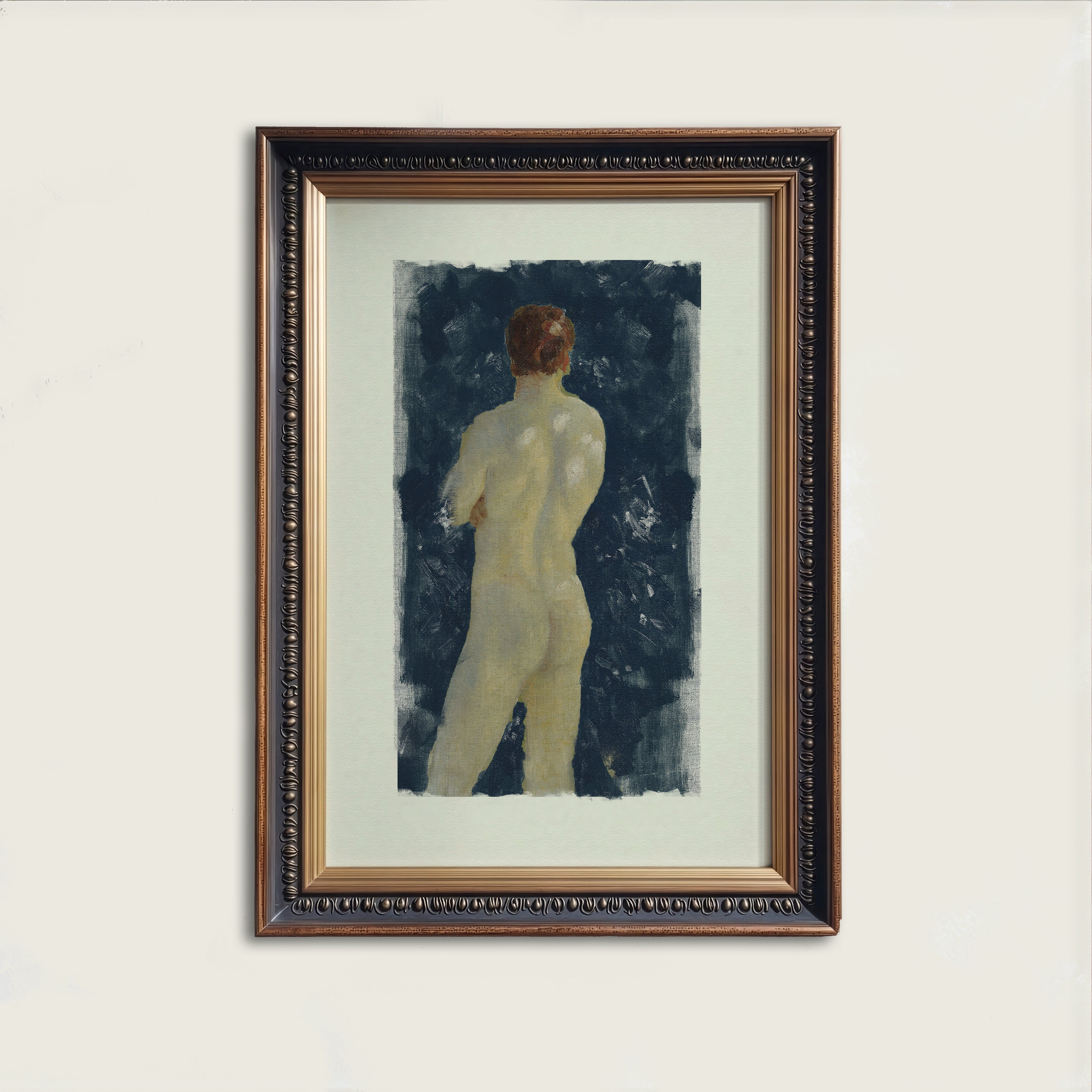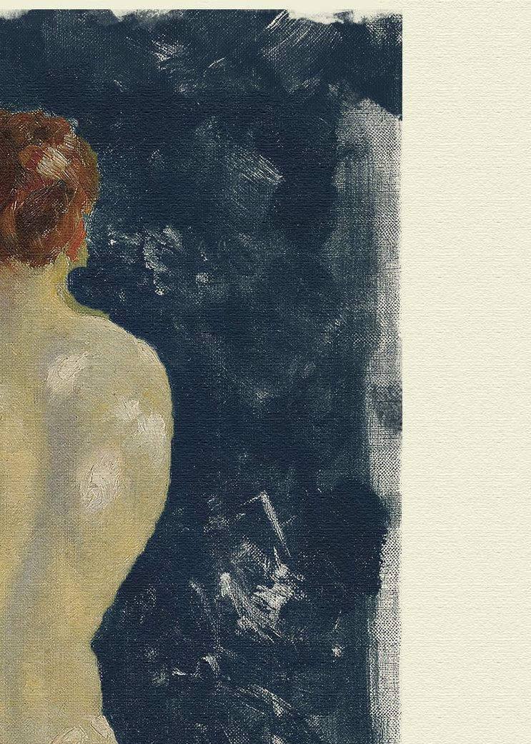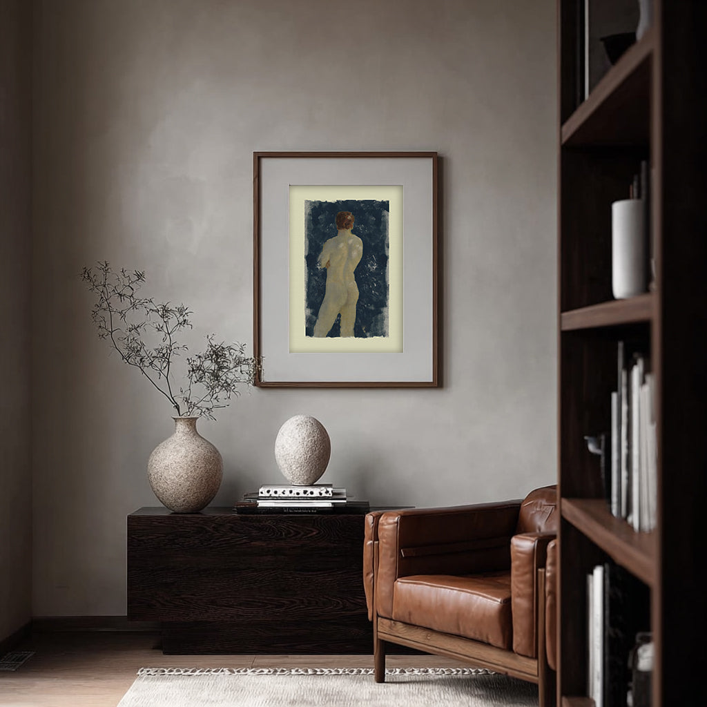 Linger is a figurative art print depicting a softly rendered nude figure set against a deep, painterly blue backdrop. Subtle brushwork and a muted, neutral palette create a timeless, gallery-inspired aesthetic with quiet emotional depth. Elegant and understated, this piece suits modern classic, European-inspired, and collected interiors, adding artistic warmth and sophistication to bedrooms, studies, and curated gallery walls.