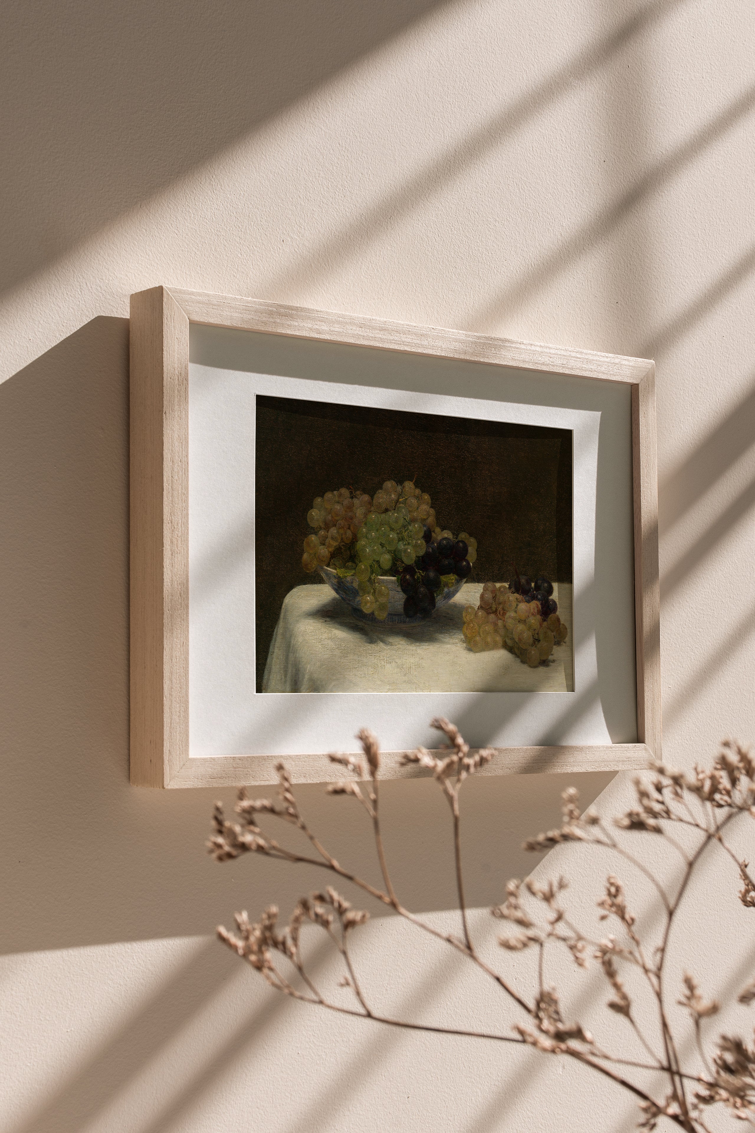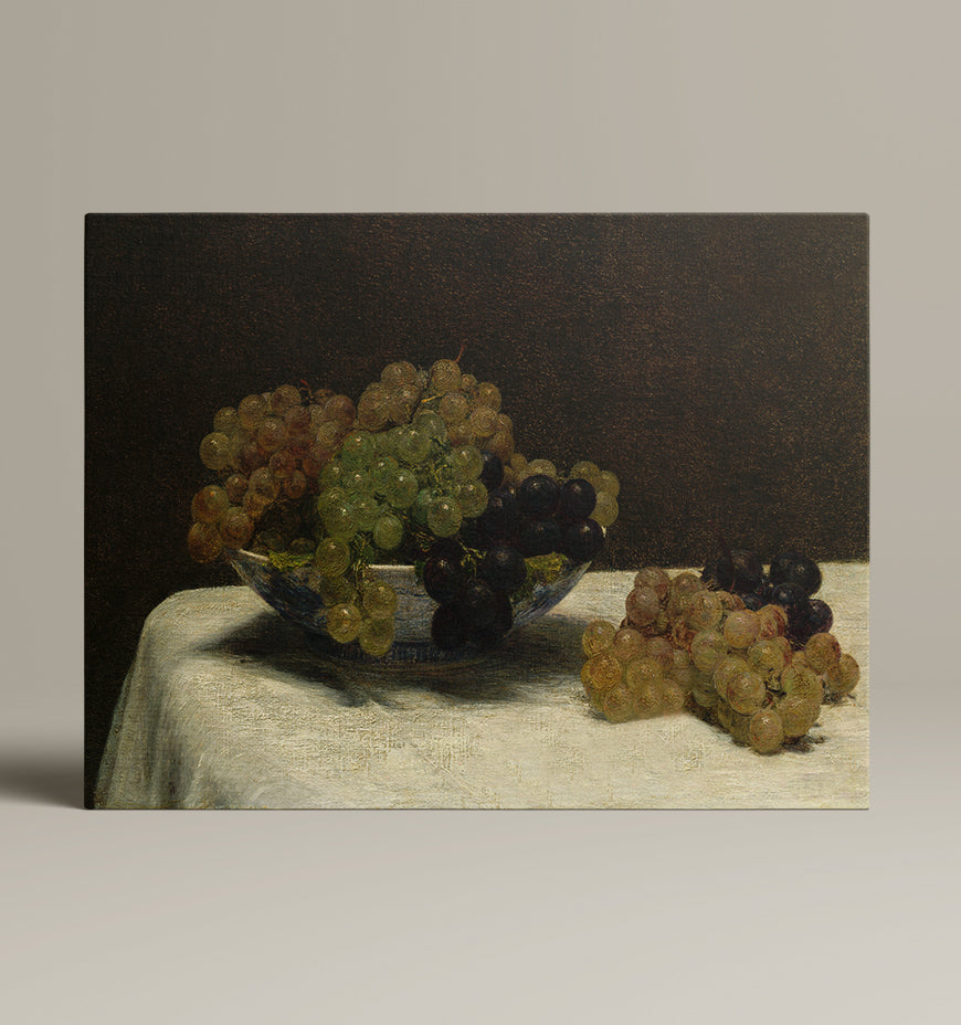 This classic painting depicts the simplistic moment of a bowl of grapes, Rich in a moody tonality, this beautiful piece will elevates any room.