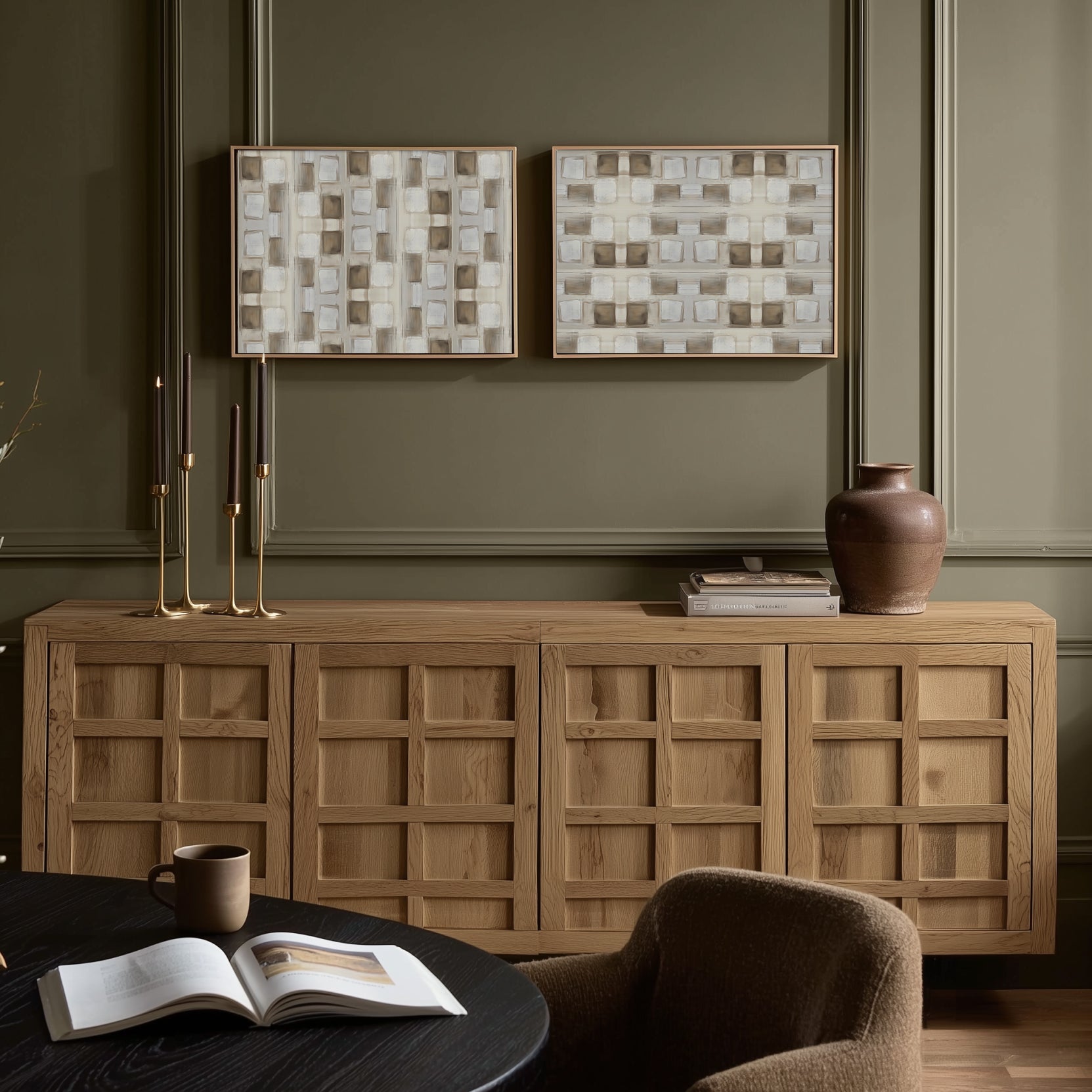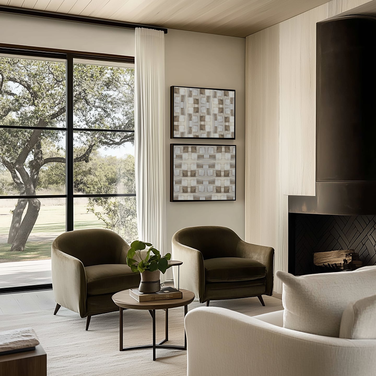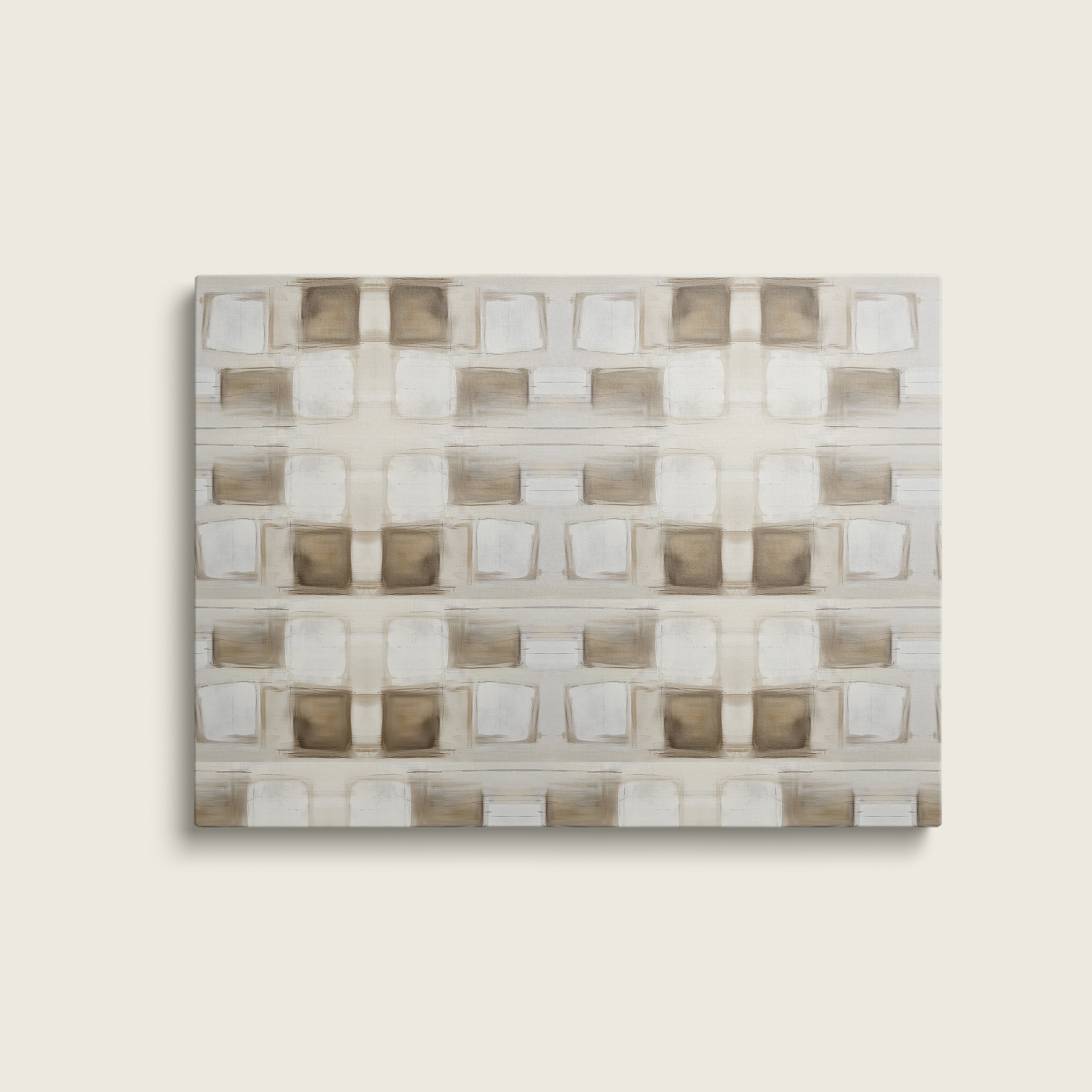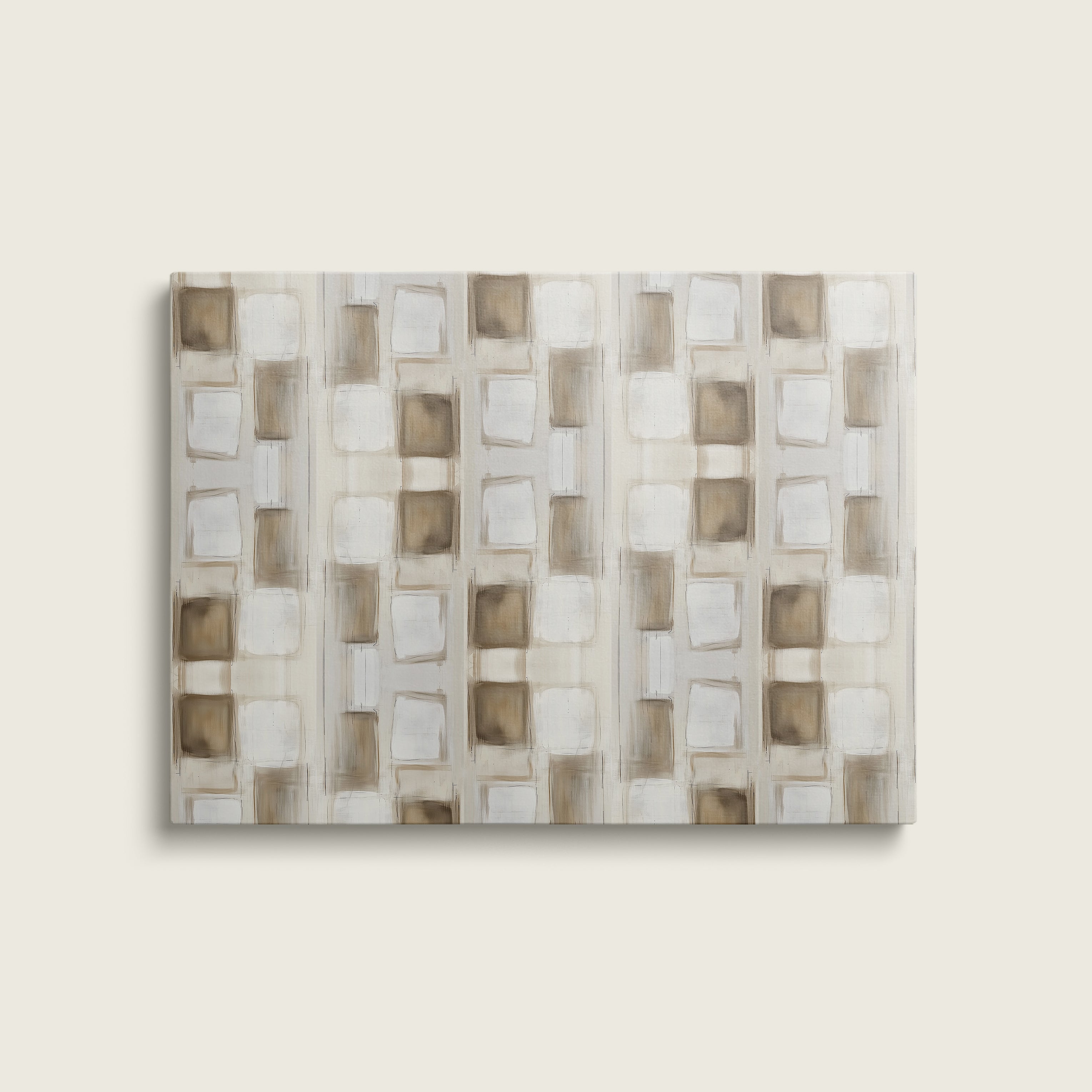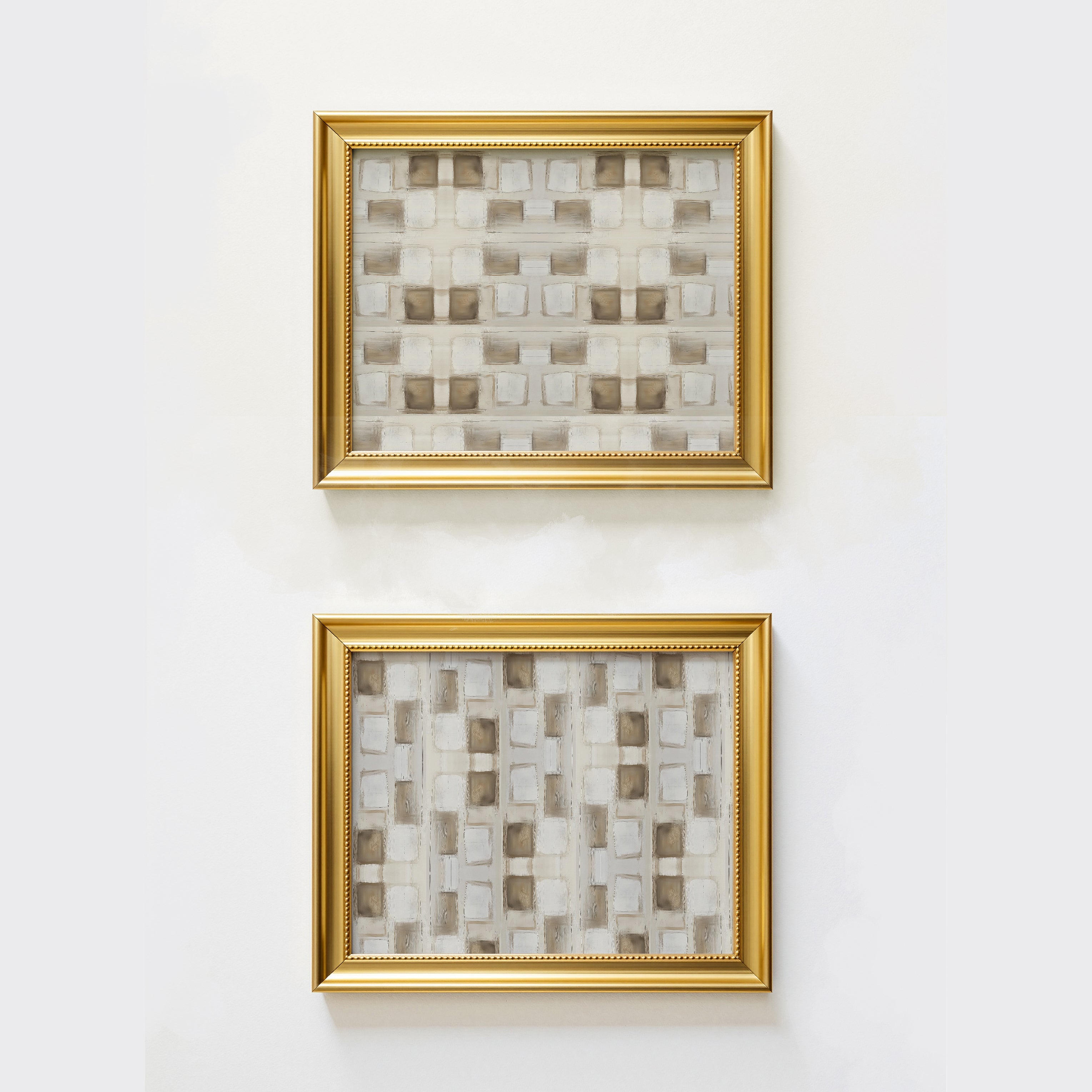 Enjoy this set of two of our print Trance. Grounded yet refined, this geometric neutral abstract art print brings a modern warmth to any space. With layered brushstrokes in soft beige, taupe, ivory, and warm white, the design forms a subtle grid-like pattern that feels both structured and organic. The repetition creates a soothing rhythm, evoking balance and understated sophistication.